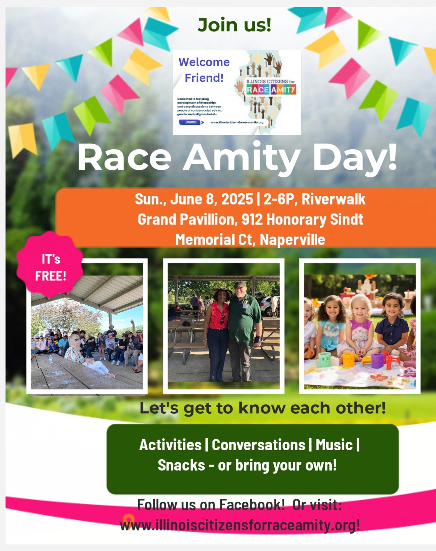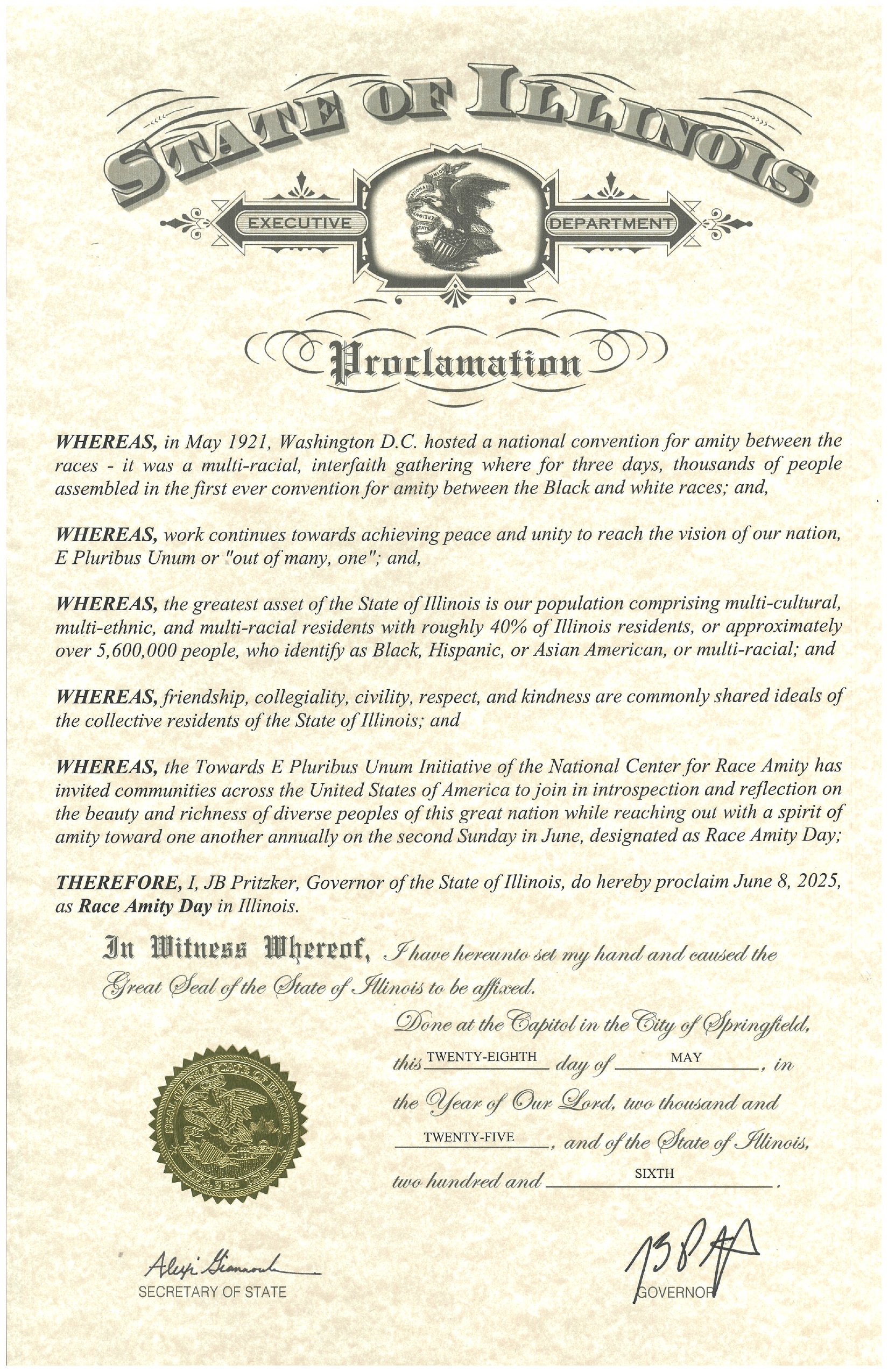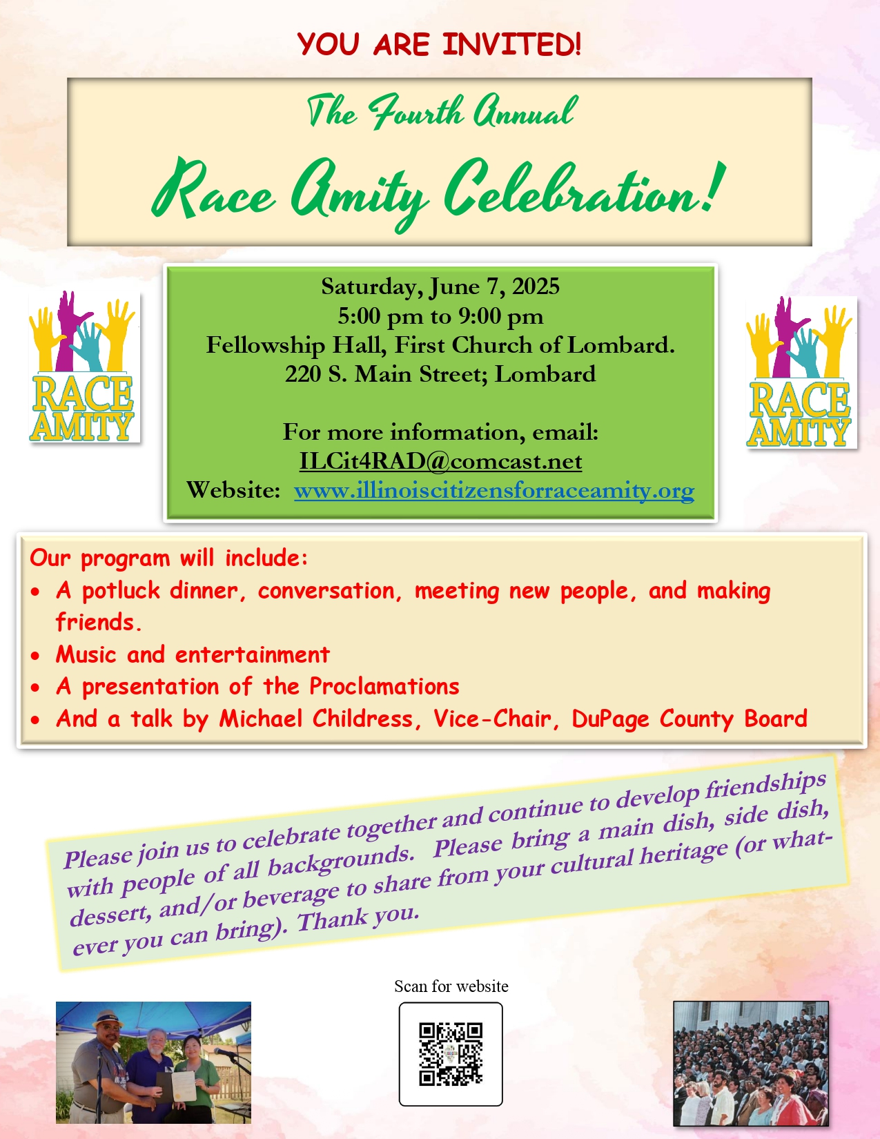 Alláh'u'Abhá! More exciting news! The State of Illinois is proclaiming Race Amity Day this year! Below are the flyers for upcoming events. The Juneteenth program is with a church that has supported Race Amity Day events in Lombard since we started. Supporting their event is an excellent opportunity for us to strengthen community with them. The Race Amity Film Series in Maywood is presented by the Bahá'ís in Maywood and has had a number of friends of the Faith in attendance. And, of course. our two Race Amity celebrations for Saturday, June 7th, in Lombard and Sunday, June 8th, in Naperville. For both events, we are anticipating a lot of attendees and a lot of good conversation. This is the 104th anniversary of the first Race Unity (Amity) Conference in Washington, DC. We have received proclamations from DuPage County Board (third year in a row), Northbrook (fourth year in a row), LaGrange, and Glen Ellyn. Other possible proclamations include City of Chicago, Cook County Board, and Villa Park